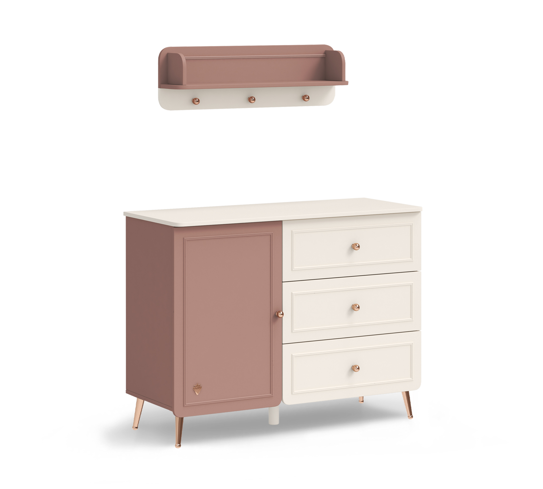 Baby Elegance kommode, der fremhæver elegance med Rossette og Vizon Cream overfladedetaljer, der passer til kollektionen, giver dig mulighed for at opbevare dit barns ting på en overskuelig måde med både låg og skuffer. Skufferne har selvbremsende skinner, der gør dem nemme at åbne og lukke lydløst, og de er sikre at bruge, så der ikke sker ulykker eller klemning.