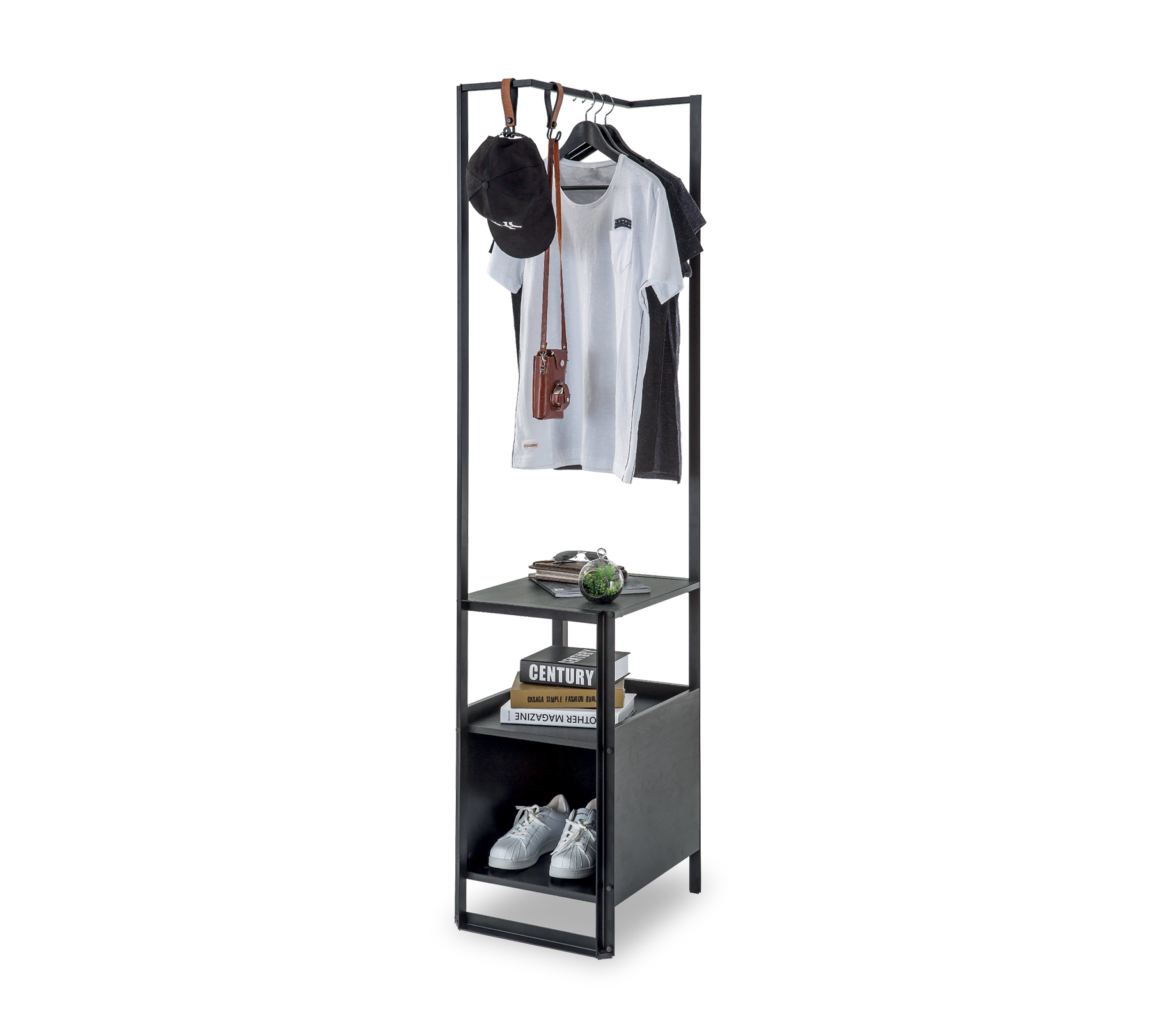 De specialfremstillede læderbøjler, der er ideelle til at hænge de produkter, som unge ofte bruger, såsom T-shirts, hatte, jakker og tasker, gør reolen til noget helt særligt.