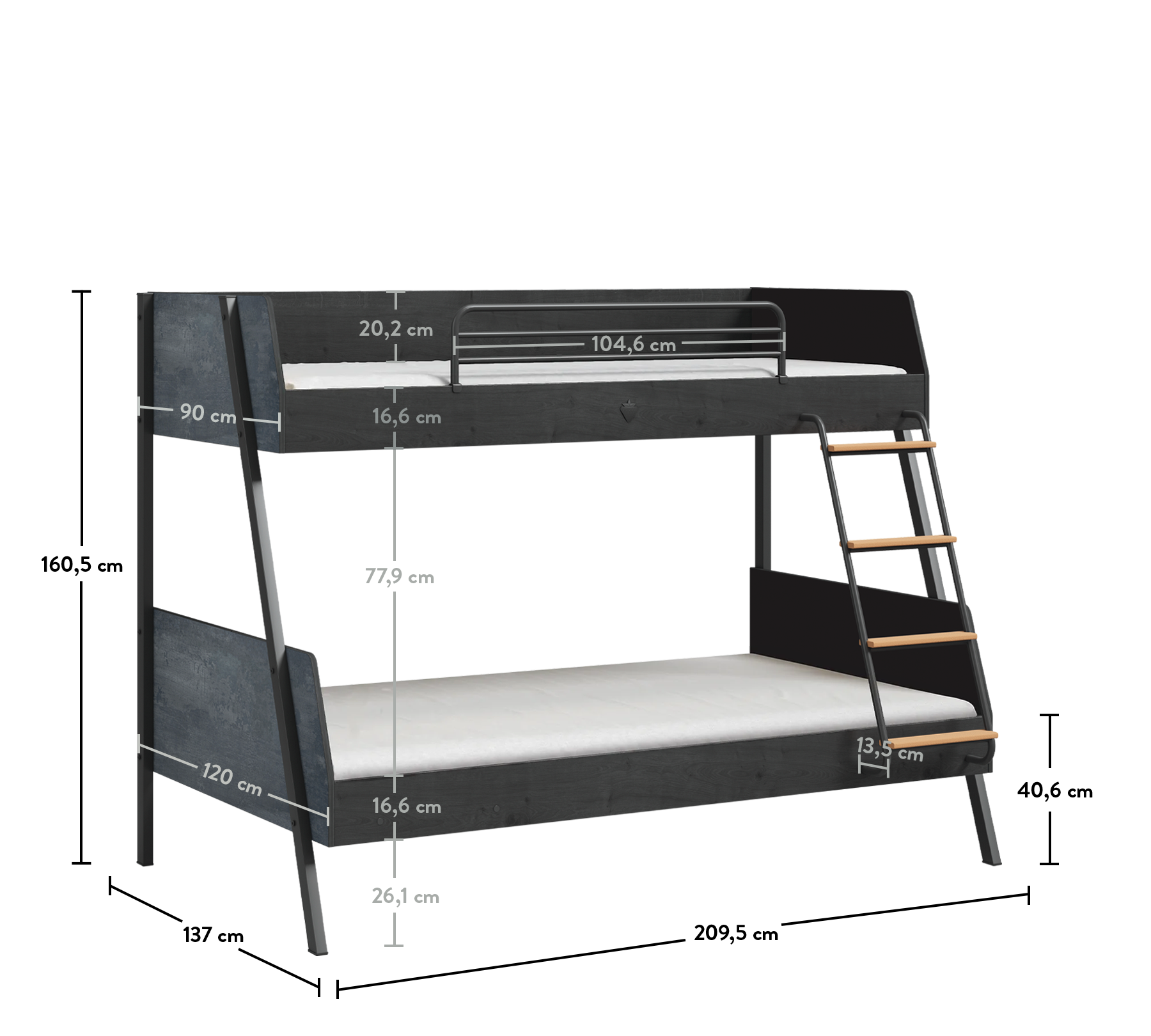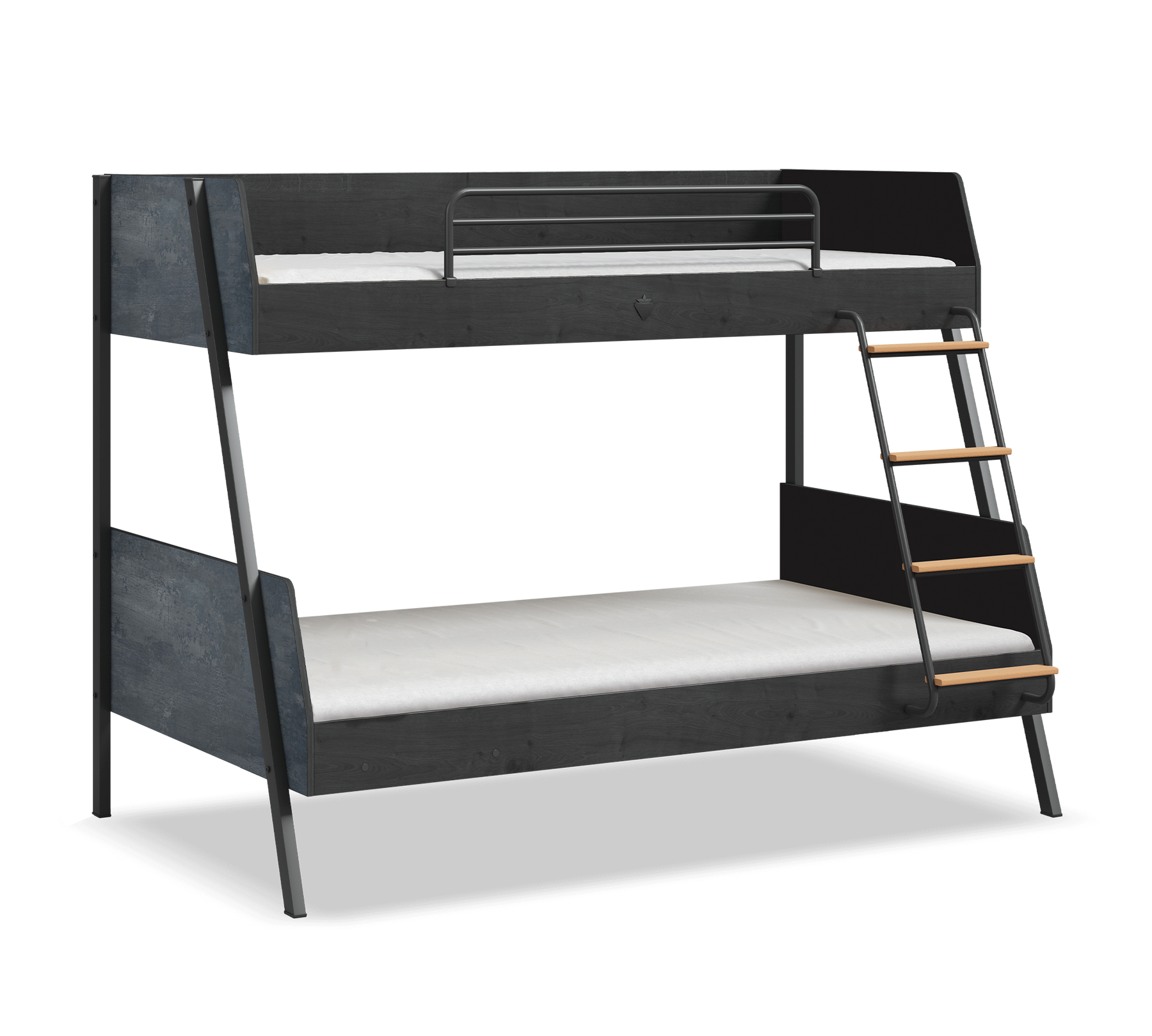 Dark Metal Wide Bunk Bed er blandt de mest populære køjesenge med sit praktiske og harmoniske design, der giver ekstra komfort. Trappetrinene er lavet med en gofrato-mønstret maleteknik. Denne teknik forhindrer børnene i at glide, når de går op og ned ad trappen.