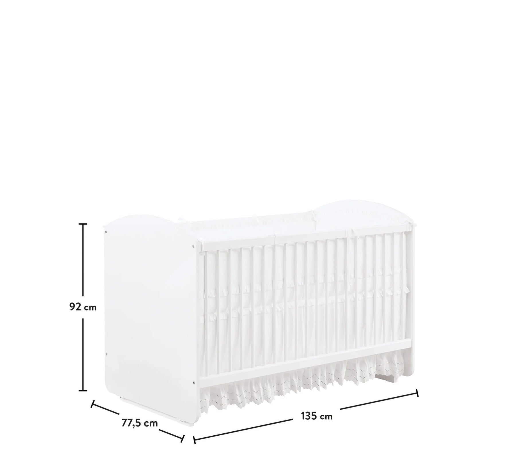 Den hvide gyngende babyseng, der kan justeres i 3 trin og hjælper dig med at tage og lægge dit barn komfortabelt, måler 135x92x77 cm. Den gyngende babyseng kan bruges, indtil barnet er 3 år. Låsemekanismen gør det muligt at fastlåse sengen, når du ønsker det. Med den praktiske hvide babyseng kan du give dit barn de sødeste drømme.