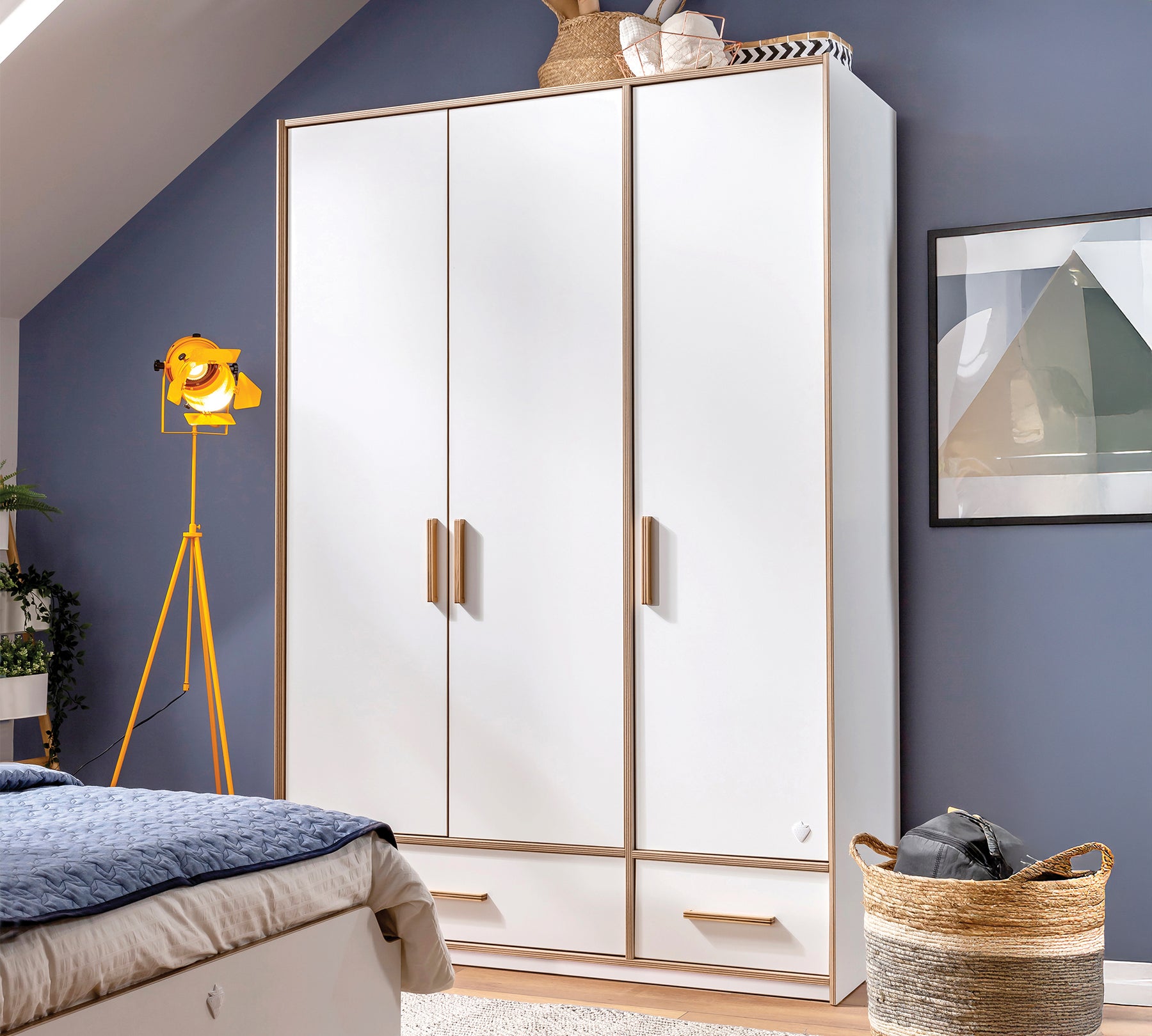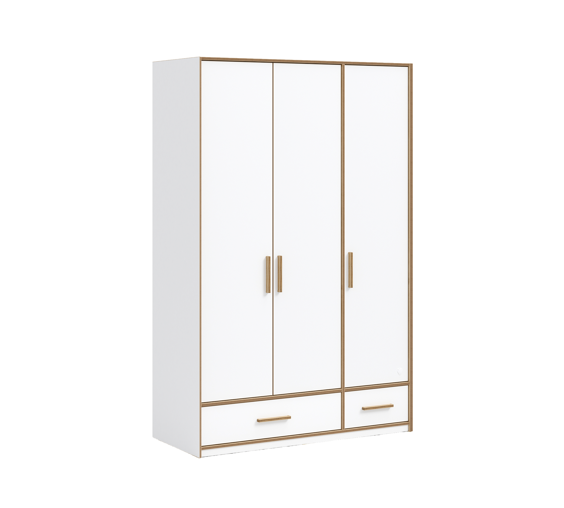 Modera 3-dørs skab er elegant med sine håndtag i farverne bøg og valnød, justerbart hyldesystem, brede bøjleholdere, ventilationskapsel, skuffer med ruminddeling, sportspejl i lågen og rum til personlige ejendele, og tilbyder mange anvendelsesmuligheder. For en mere sikker brug anbefales det at bruge den medfølgende vægbeslag til skabet.