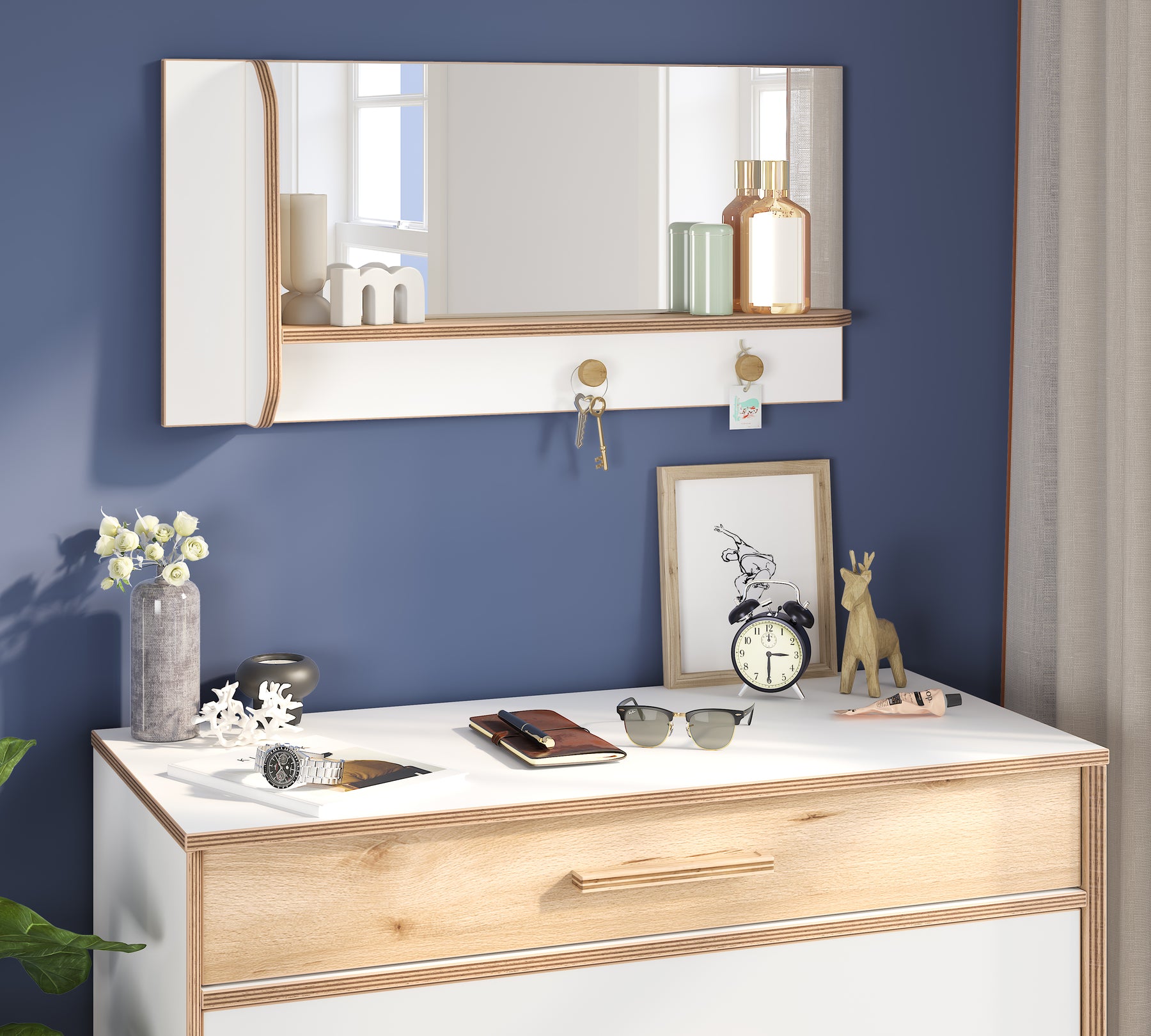 Modera vægspegel med hylde kan bruges både vandret og lodret og tilbyder dermed fleksible anvendelsesmuligheder. De to kroge på spejlet gør det muligt at hænge tasker, smykker eller små accessories op på en praktisk måde. På den måde skaber spejlet både en dekorativ og funktionel orden og bliver et komplet supplement til ungdomsværelset.