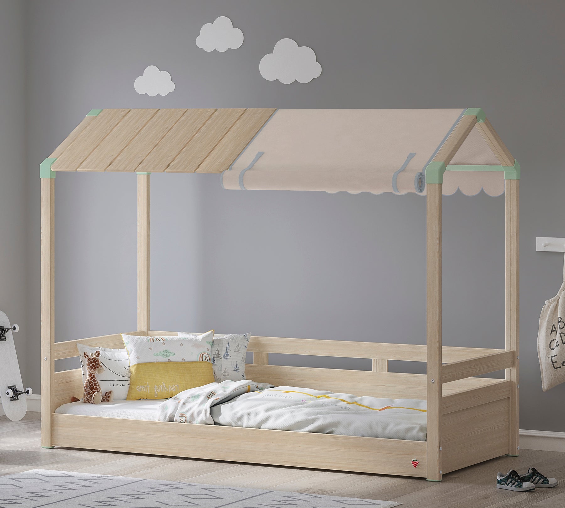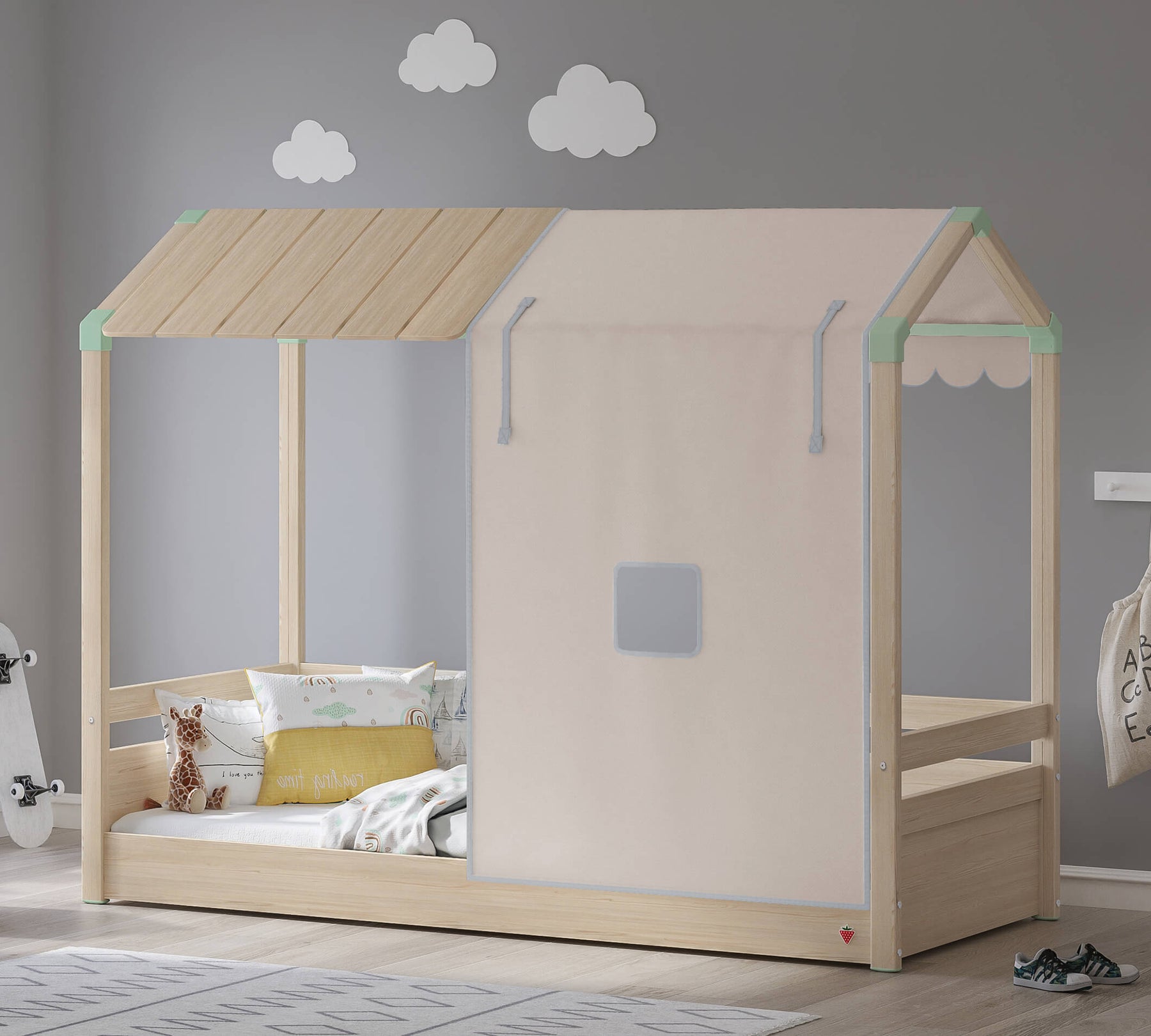Montes Flad Tag Seng Halv Telt er designet til at passe til teltet og fås i tre forskellige farver. Det er muligt at dække hele taget med 2 produkter. Montes Flad Tag Seng Telt er det søde hus, som børnene drømmer om, når de leger hus.