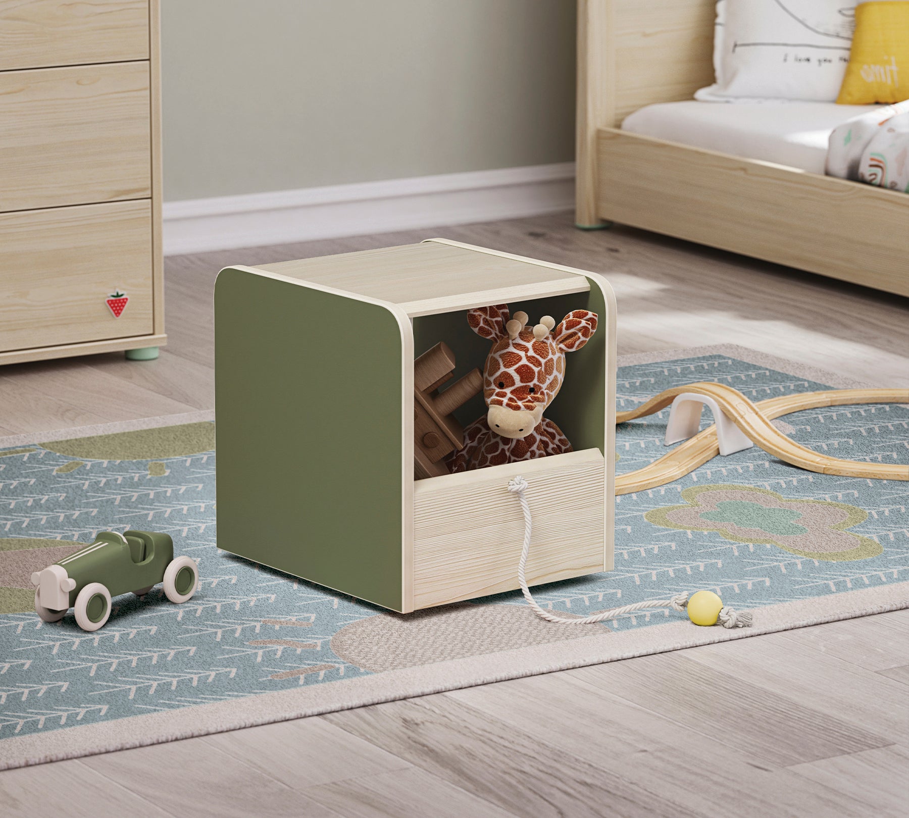 Montes Natural Legetøjskiste Puf er et legeredskab med hjul og rebdetaljer. De grønne overflader på siden er et tegneområde, der fremmer produktiviteten med fast kridt. Med denne funktionelle puf, der også har plads til at opbevare dit barns legetøj, kan du skabe et helt nyt livsrum til dit barn.