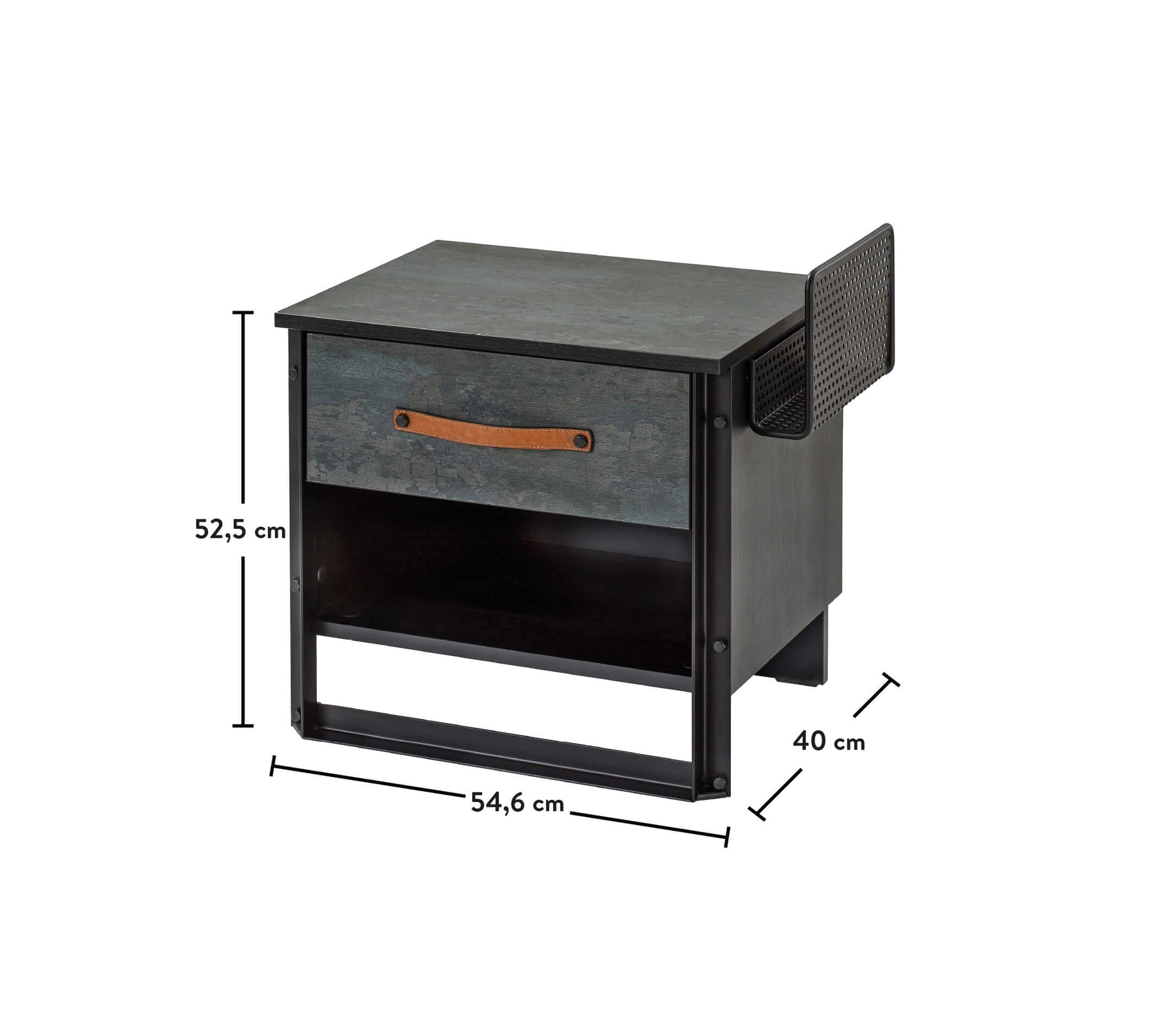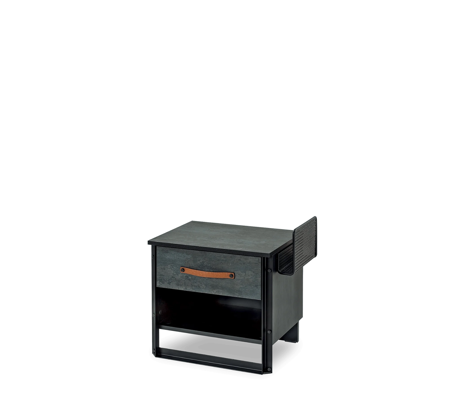 Dette natbord passer til alle senge i Dark Metal-serien og er praktisk at bruge takket være de to forskellige størrelser af skuffer og hylder. Natbordet har metalstel og er højt, hvilket gør det nemmere at gøre rent. Med metalrummet på siden er Dark Metal-natbordet nemt at opbevare småting i, og det kan også bruges til at give forskellige ideer til udnyttelse af pladsen.