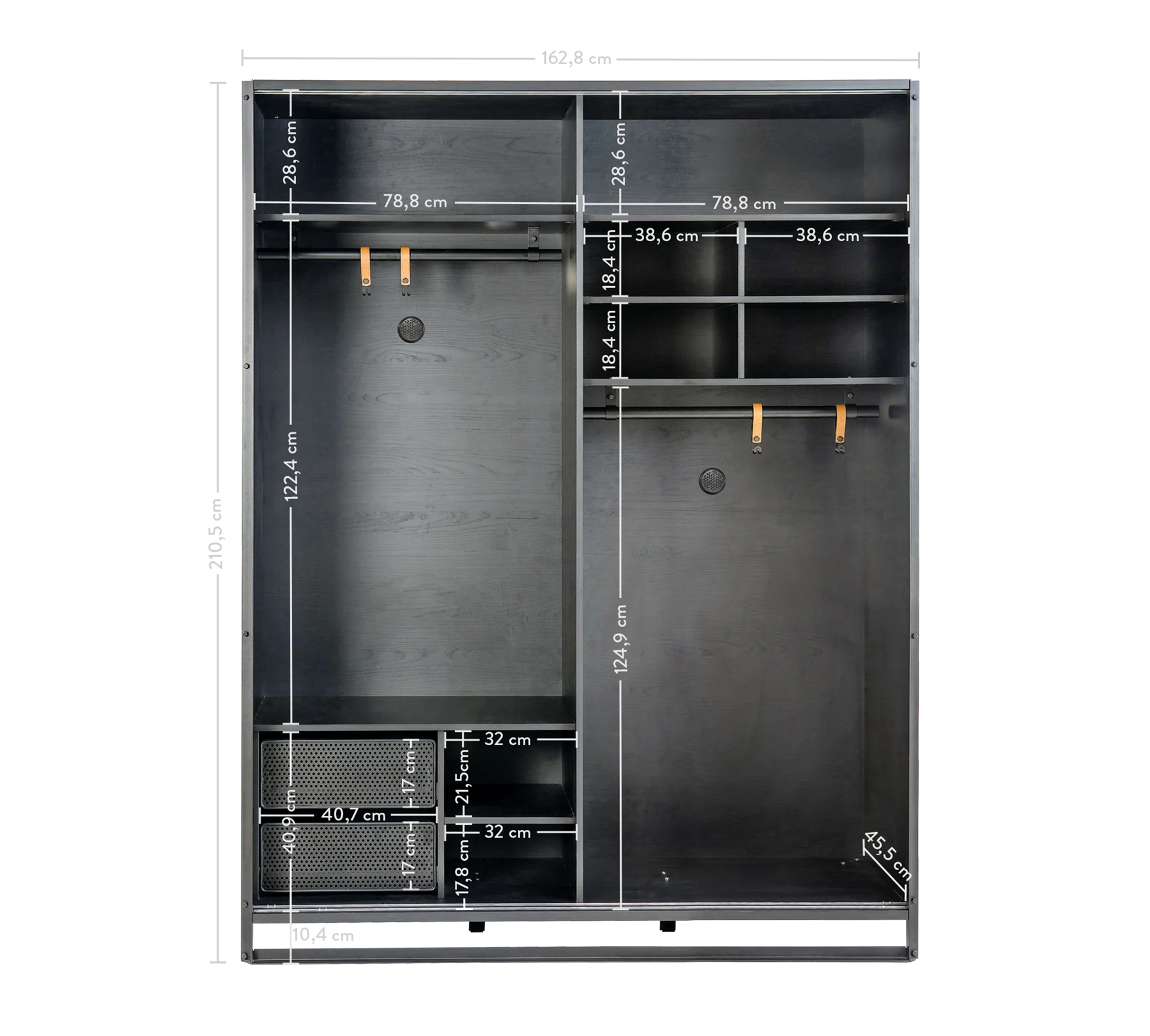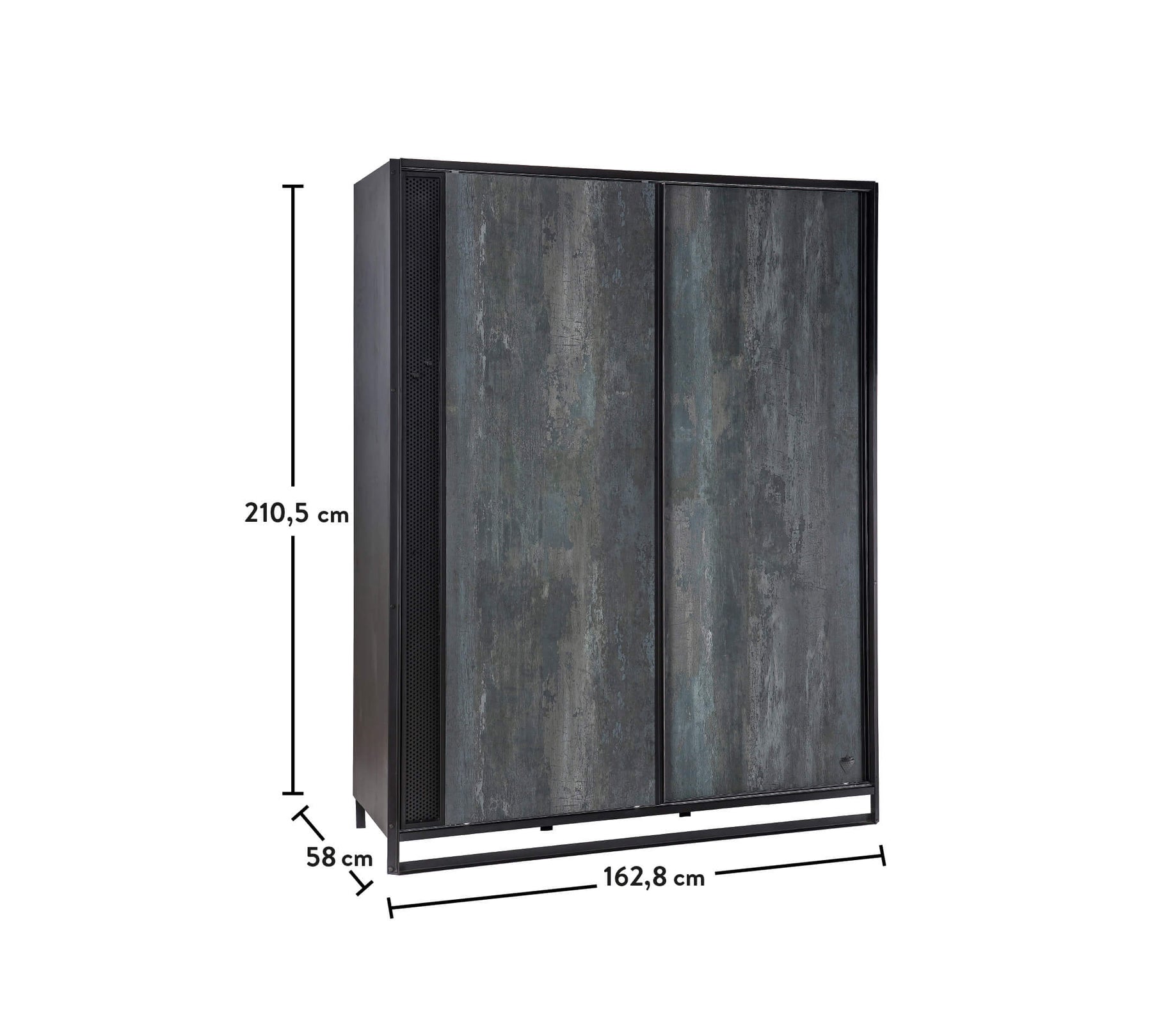 Mørk metal skuffeskab med metalrammer ændrer stemningen i ungdomsværelset med sit industrielle design. Takket være det store rumfang tilbyder det multifunktionel opbevaringsplads, mens to tøjstænger giver mulighed for en overskuelig brug af pladsen. Skydelåger og omhyggeligt formede hylder, hængsler med dæmpning i lågerne, ventilationskapper, vægbeslag, læderbøjler inde i skabet og 2 skuffer giver klare løsninger til personlige opbevaringsbehov.