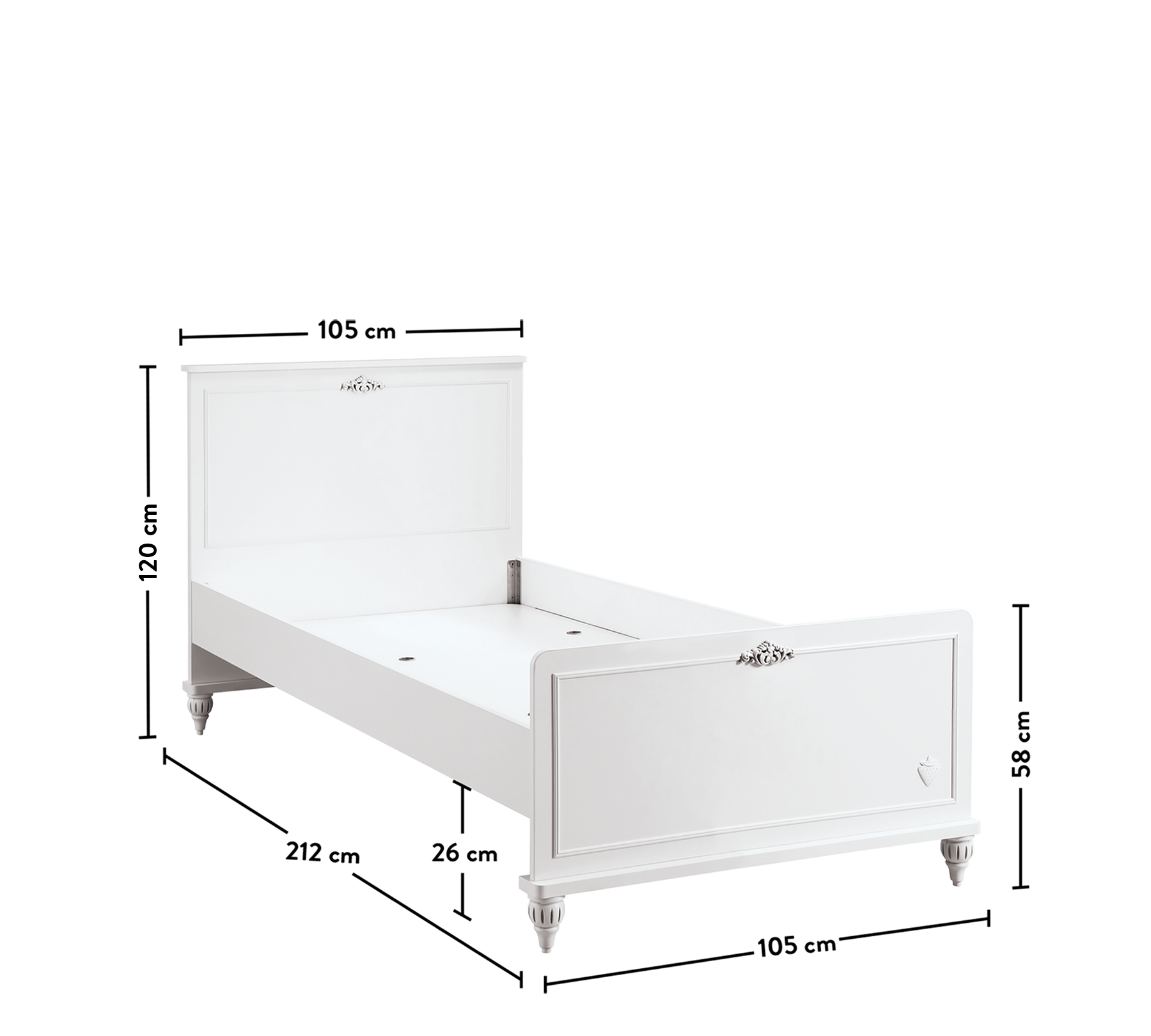 Romantica-sengen har et hvidt og elegant design, der giver den et eventyrligt udseende, og de solide materialer, den er fremstillet af, giver tryghed. De hvide detaljer og rustikke lameller i hoved- og fodenden af sengen afspejler dit barns drøm om en utopisk prinsesse.