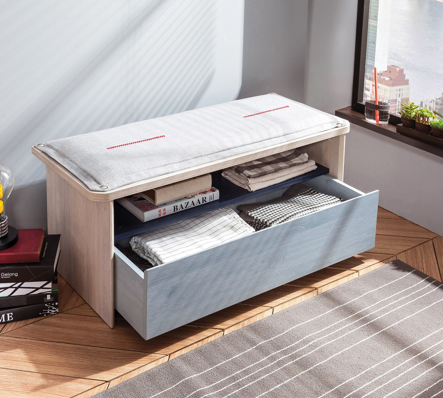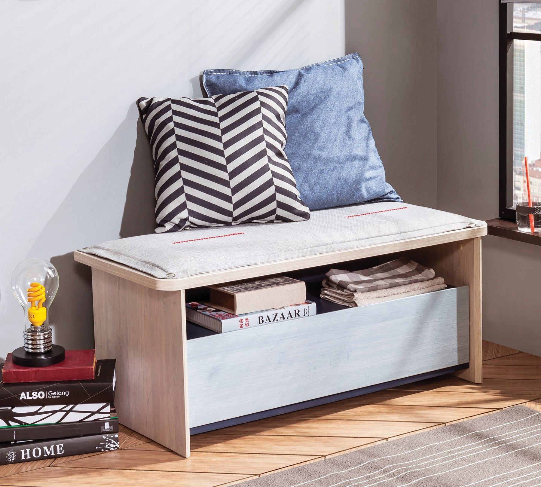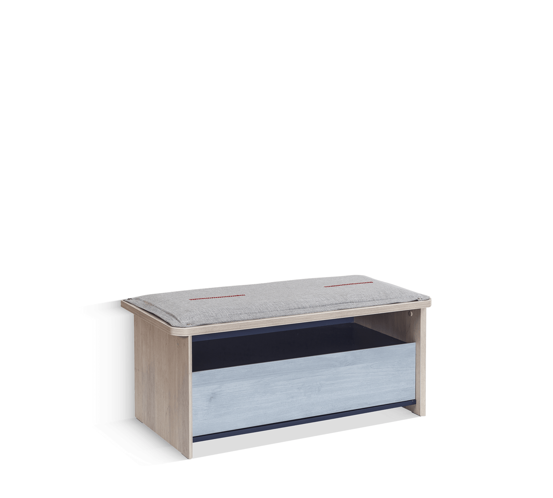 Puden kan nemt tages af og sættes på igen ved hjælp af trykknapper, så den kan rengøres. Puffen med skuffer kan ikke kun bruges som puff, men også som opbevaringsmøbel, når det er nødvendigt, og sammen med de matchende moduler giver den rummet en helhed.