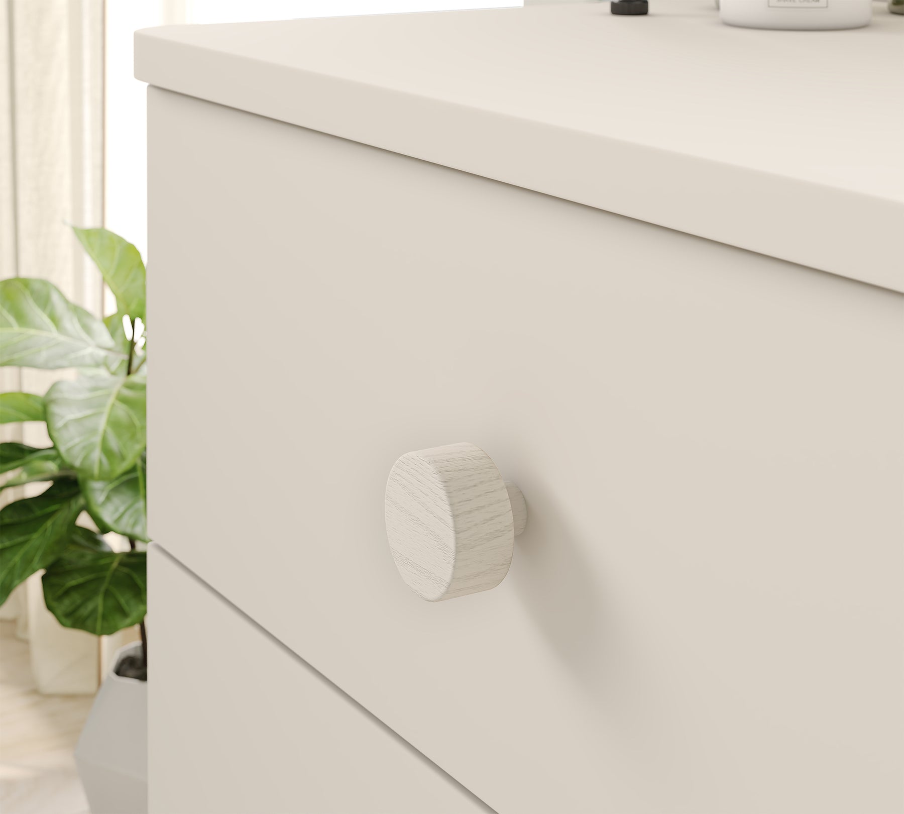 Varia Creme Nattbord har minimalistiske linjer og tilbyder både funktionalitet og æstetik i dit soveværelse. De to skuffer hjælper dig med at opbevare dine ting på en overskuelig måde. Skufferne lukker lydløst og blødt, hvilket gør dem nemme at bruge. Varia Creme Nattbord giver dit værelse et moderne udtryk med sin Vario Vizon-farve og er både et stilfuldt supplement og en hjælp, der gør din hverdag nemmere.
