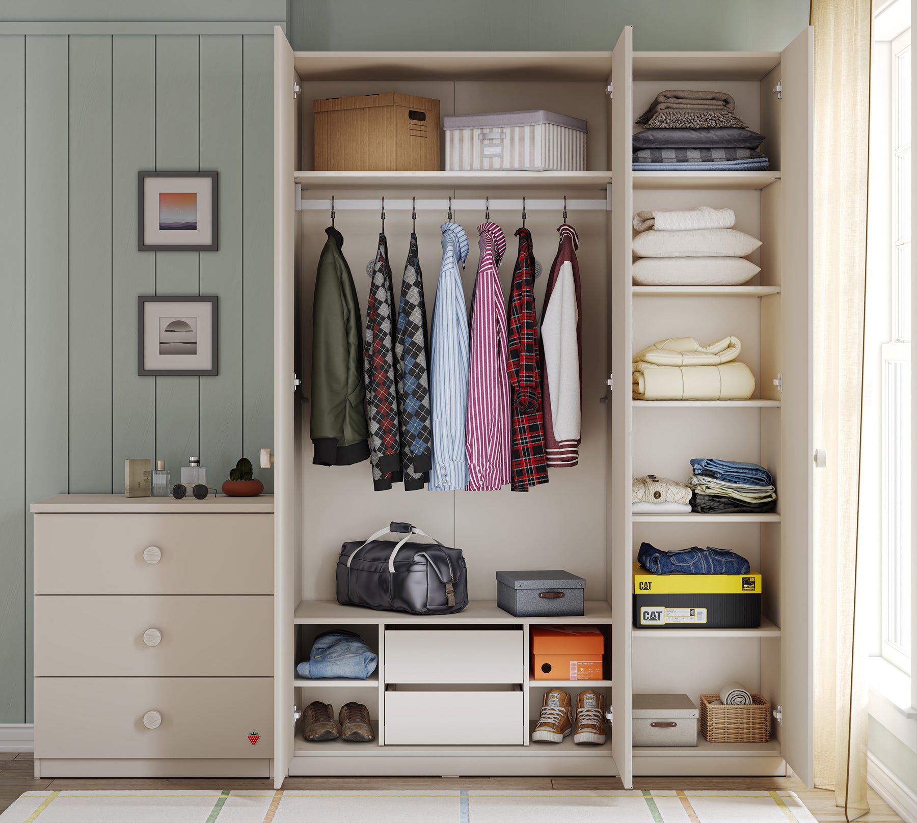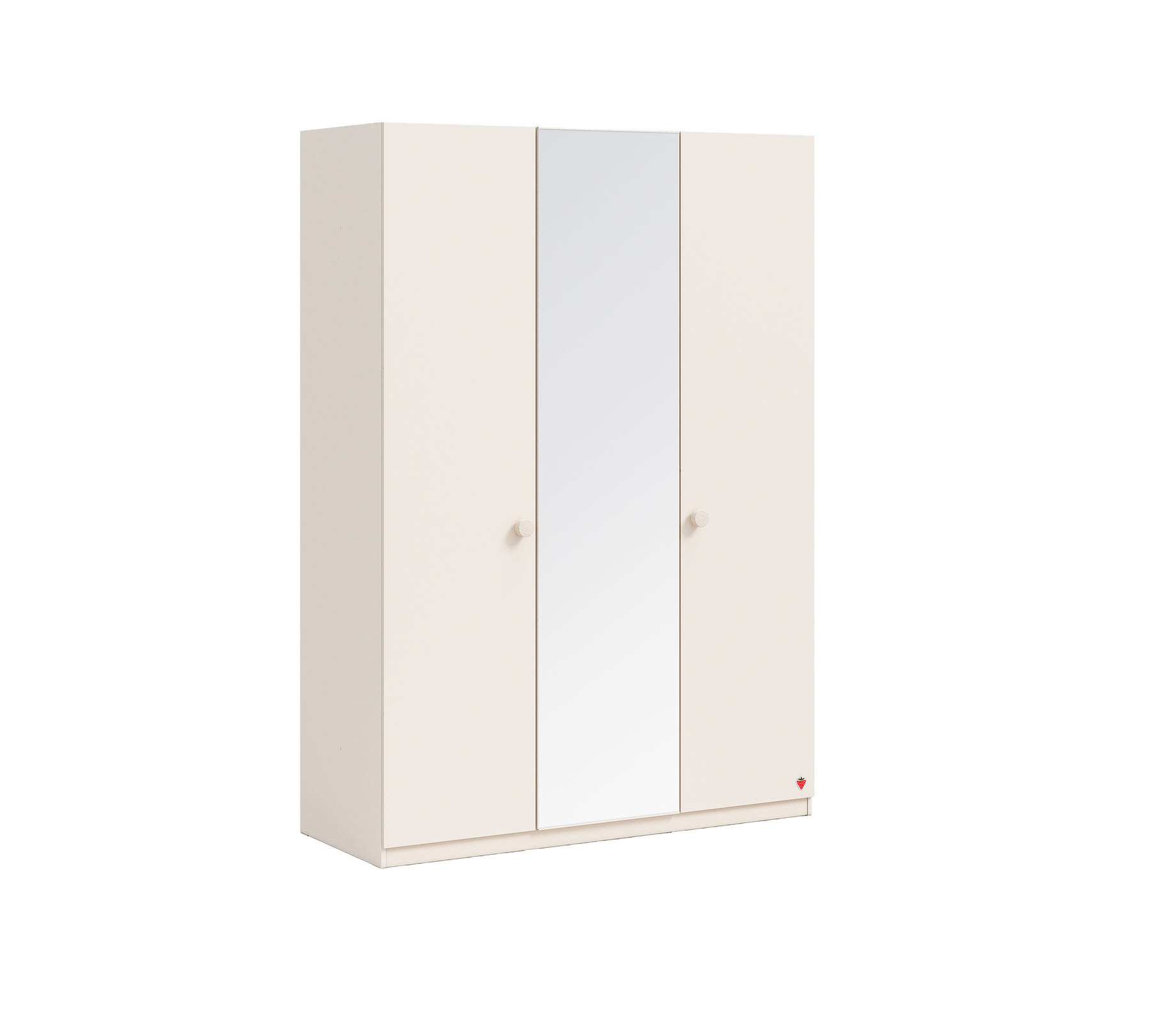 Varia Krem 3-dørs spejlskab er designet med et stort indvendigt rum, så du kan opbevare dine ting på en overskuelig måde, og det udmærker sig med sin moderne og funktionelle konstruktion. Takket være de mange hylder og bøjleområder kan du nemt opbevare dit tøj og dine ting. Med spejldetaljer og skuffer i det indre rum bringer det både stil og funktionalitet til dit værelse. Med bløde hængsler, stilfulde træhåndtag og et robust stel garanterer det lang levetid. Med vægbeslag, der øger sikkerheden, er det et produkt, du kan vælge med ro i sindet.